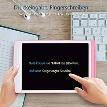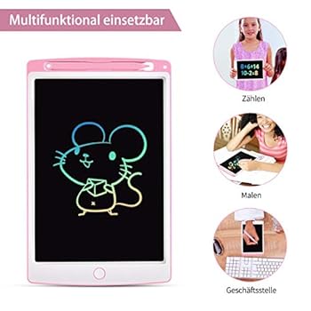 Seit der Einschulung, haben wir nun einen mächtigen Papierverbrauch festgestellt. Töchterchen ist kräftig zu Hause am üben und so geht einiges an Papier drauf.Am ersten Elternabend bekamen wir den Tipp eines Vaters, dass es schöne LCD Tablets gibt, worauf die Kids schön üben können, ohne immensen Papierverbrauch.Daraufhin stöberten wir gleich auf Amazon, weil man hier einfach schnell und gemütlich alles findet und Ruck Zuck war die Passende gefunden.Da wir 2 Mädels haben die sich zuerst einmal eine Teilen, musste das Tablet natürlich Rosa sein und damit es nicht langweilig wird, die Schriftfarbe bunt.Kaum angekommen konnte es auch schon los gehen, Batterie war enthalten und die Handhabung ist sehr einfach. Der Stift ist in der selben Farbe wie das Tablet. Im Rahmen ist eine Aussparung wo man den Stift einclippen kann und dieser hält sehr gut und richtig fest darin.Es gibt einen Schalter am Rand Rahmen, wo man das Bild, Notiz oder die Info "sichern" kann, sprich dass Bild kann per Knopfdruck nicht gelöscht werden. Der quadratische größere Knopf ist zum löschen.Man kann nur komplett löschen und nicht nur Bruchteile, aber dass stört die Kids nicht.Das Tablet funktioniert super und per Knopfdruck wird wie von Zauberhand alles gelöscht ohne Reste zu hinterlassen. Seitdem es da ist, ist es schon mächtig im Gebrauch gewesen und der Zustand ist nach wie vor Top ohne Kratzer.