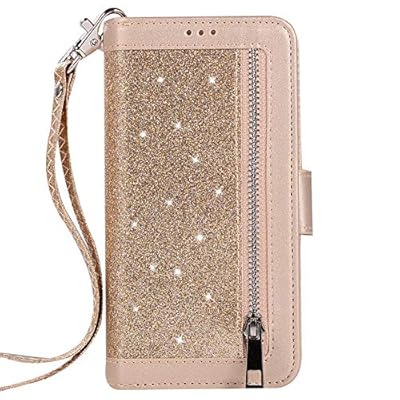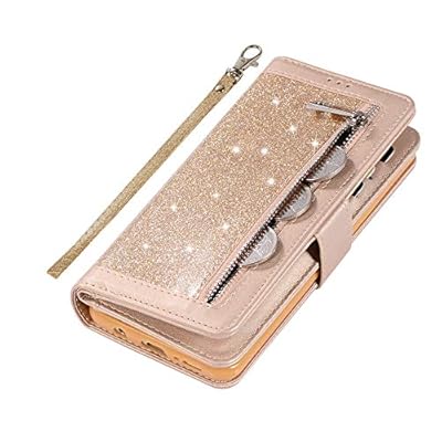 JAWSEU Handyhülle für Samsung Galaxy A70 Hülle Glänzend Bling Glitzer PU Leder Hülle Flip Case Schutzhülle Tasche Geldbörse mit 9 Kartenfach Reißverschluss Klapphülle Brieftasche Wallet Case,Gold Das perfekte Geschenk für kinder.