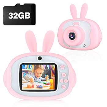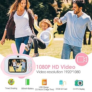 Kamera Kinder, Wiederaufladbar Digitalkamera Kinder, Kaninchen-Design Digitalkamera Videokamera Fotoapparat Junge Mädchen Full HD 1080P 2.4 Zoll LCD Bildschirm 32GB TF Karte Das perfekte Geschenk für kinder.